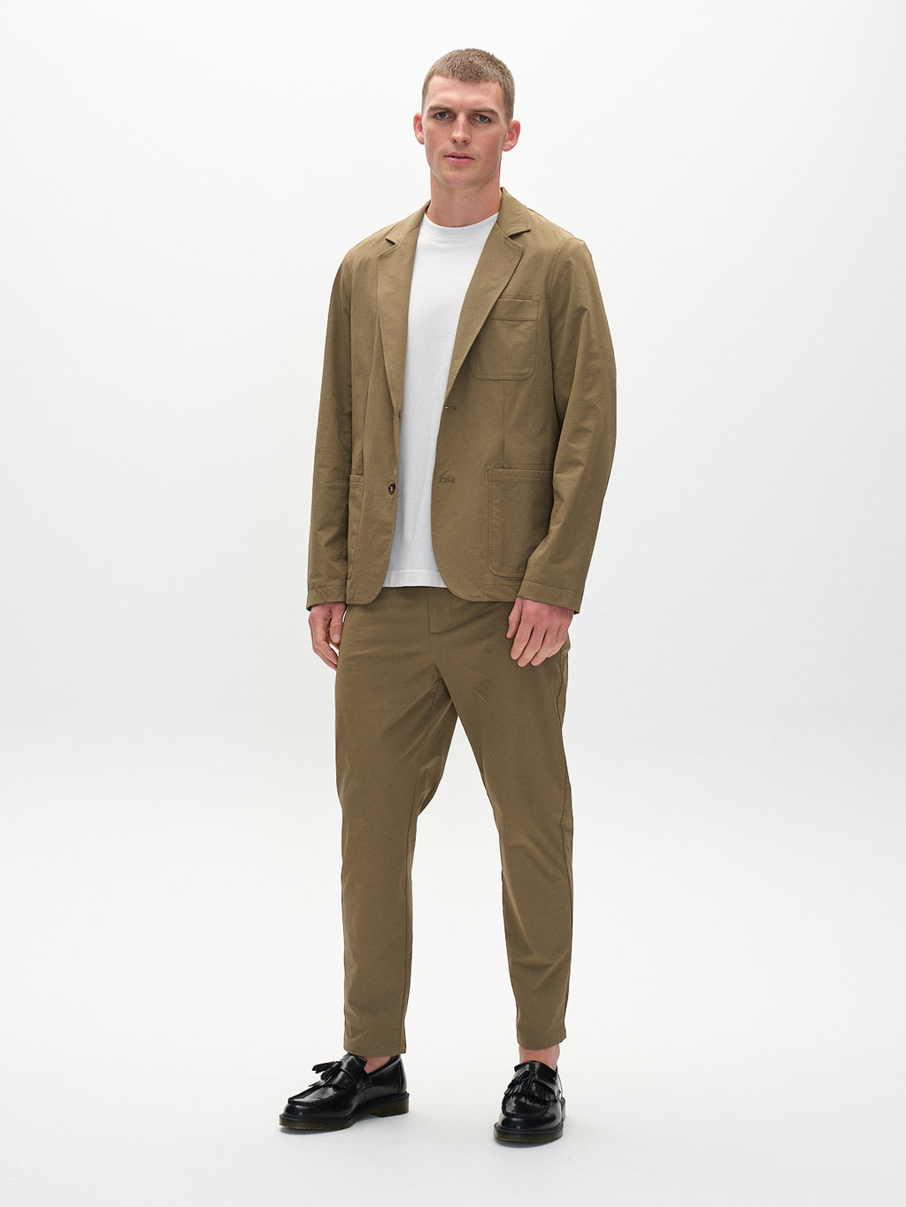 The Plaza Tech - Army by Gabba is an olive green blazer featuring notched lapels, a two-button closure, and a tailored fit. It includes three spacious front patch pockets and is displayed on a plain white background.
